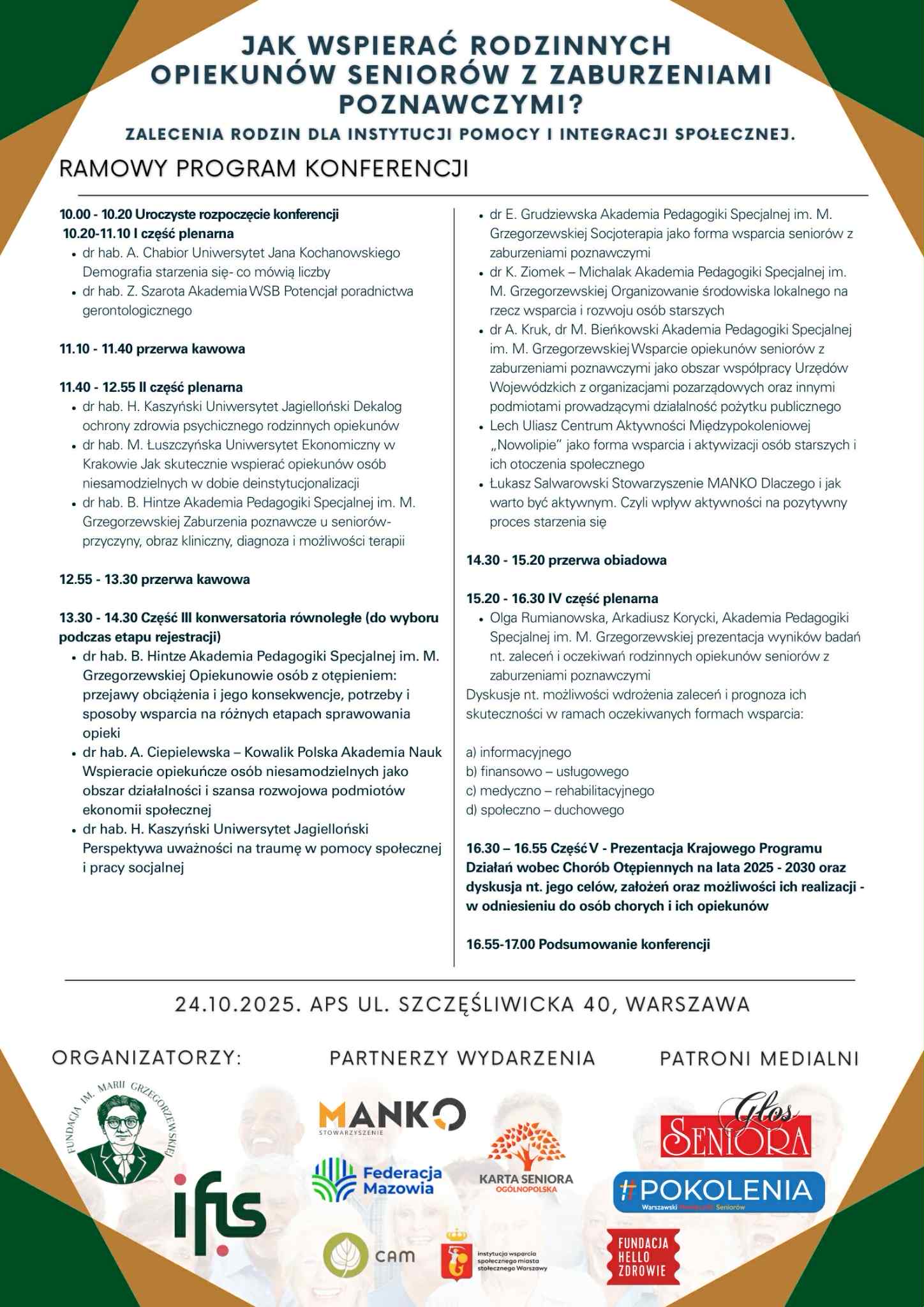 Konferencja skoncentruje się na możliwościach i kierunkach wsparcia rodzinnych opiekunów seniorów z zaburzeniami poznawczymi, realizowanego przez instytucje pomocy i integracji społecznej, instytucje kultury, urzędy samorządowe i wojewódzkie, podmioty ekonomii społecznej oraz inne organizacje działające na rzecz osób starszych i ich opiekunów.
