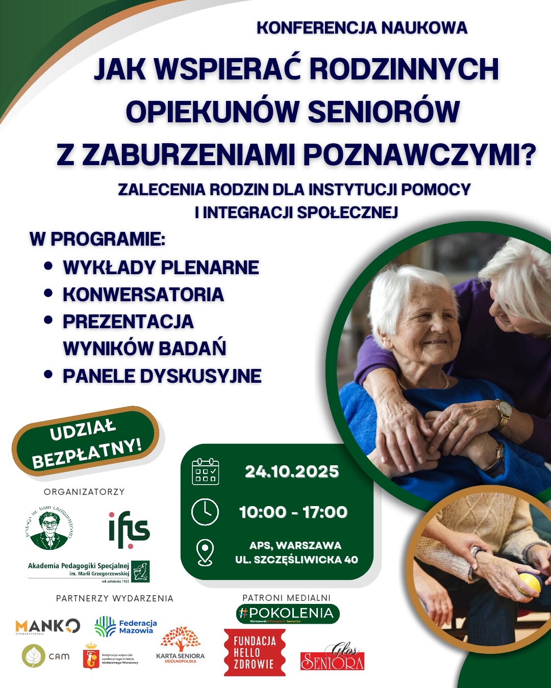 Konferencja "Jak wspierać rodzinnych opiekunów seniorów z zaburzeniami poznawczymi? Zalecenia rodzin dla instytucji pomocy i integracji społecznej"