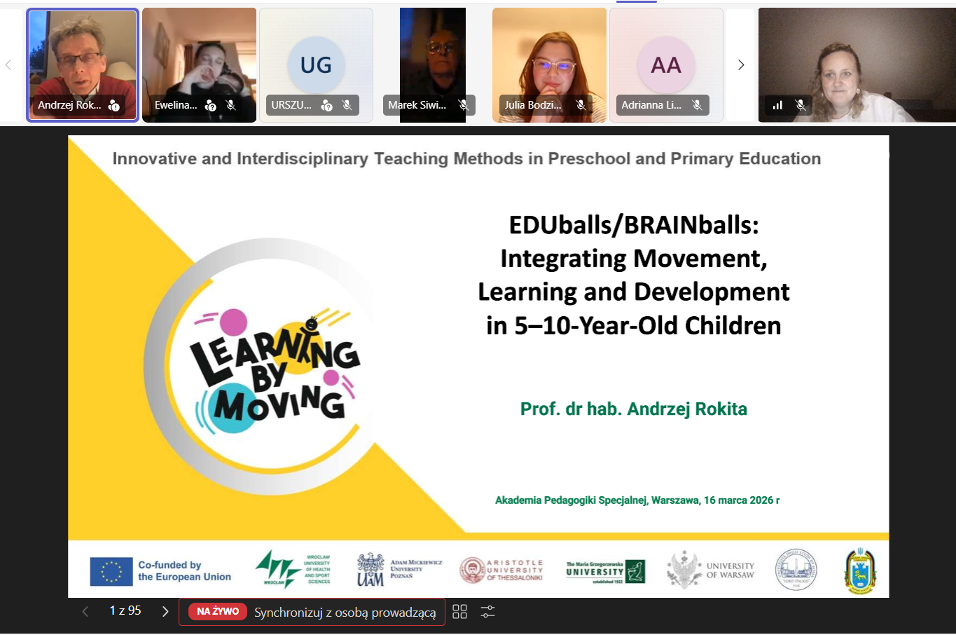 Dziś zrealizowano drugie szkolenie w ramach międzynarodowego projektu „Learning by Moving!”, koordynowanego przez Akademię Wychowania Fizycznego we Wrocławiu. Tym razem uczestniczki i uczestnicy mieli okazję pracować z koncepcją EDUball/BRAINball, którą zaprezentował prof. Andrzej Rokita – twórca innowacyjnych rozwiązań łączących edukację szkolną z aktywnością fizyczną.